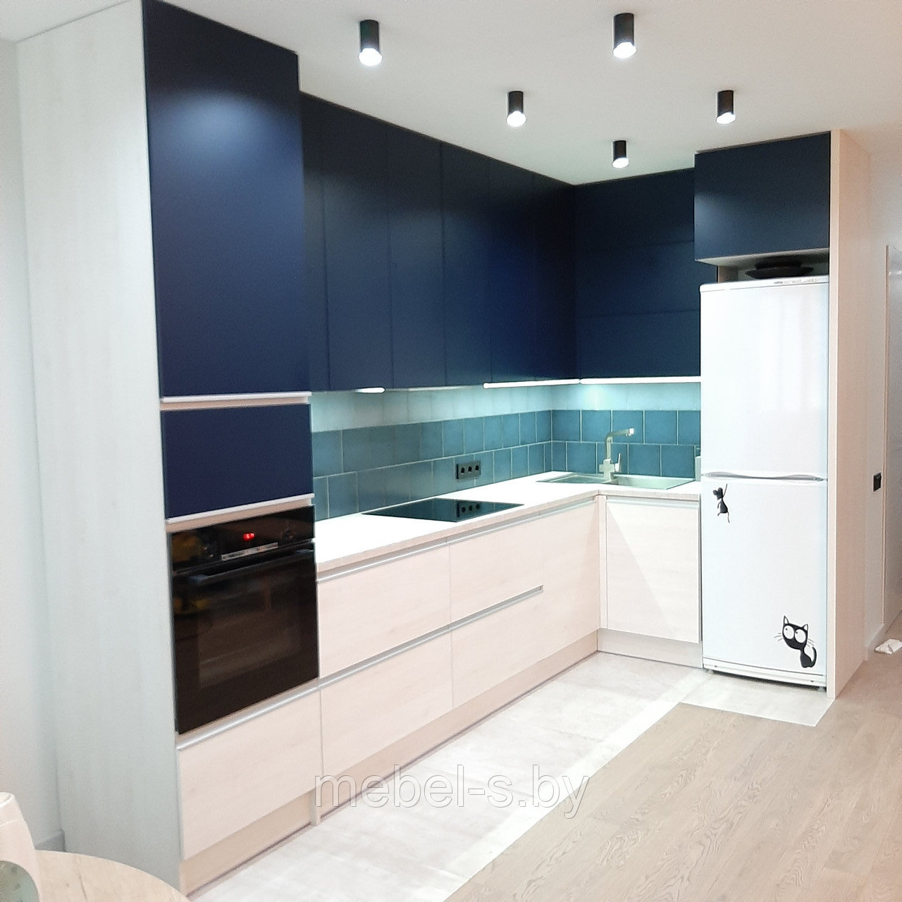 Верхние фасады- МДФ крашеная с покрытием софттач, нижние- Эггер с минтегрированной алюминиевой ручкой, постформинг Эггер, фурнитура GTV+Blum. СВЧ спрятана за фасад с уникальним подъёмником Blum HL.