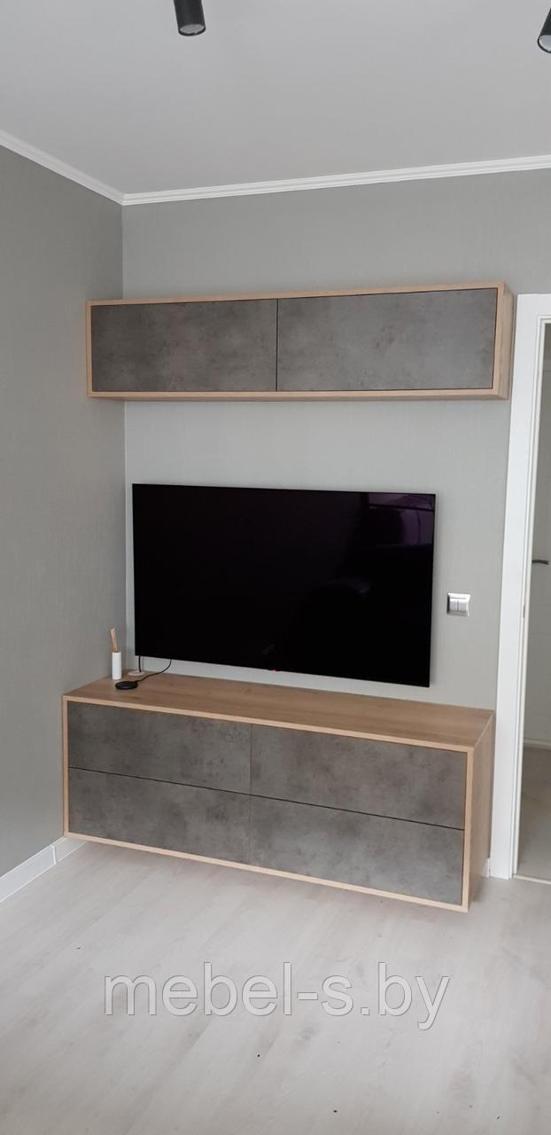 Мебель изготовлена из ДСП Эггер Галифакс натуральный и Бетон Чикаго тёмный. Тумба нижняя подвесная с 4-мя ящиками 1540*450*500, фурнитура Тандем Блюм с тип он. Шкафчик навесной 1540*260*360, открывание вверх подъёмник Блюм HKs с тип он.