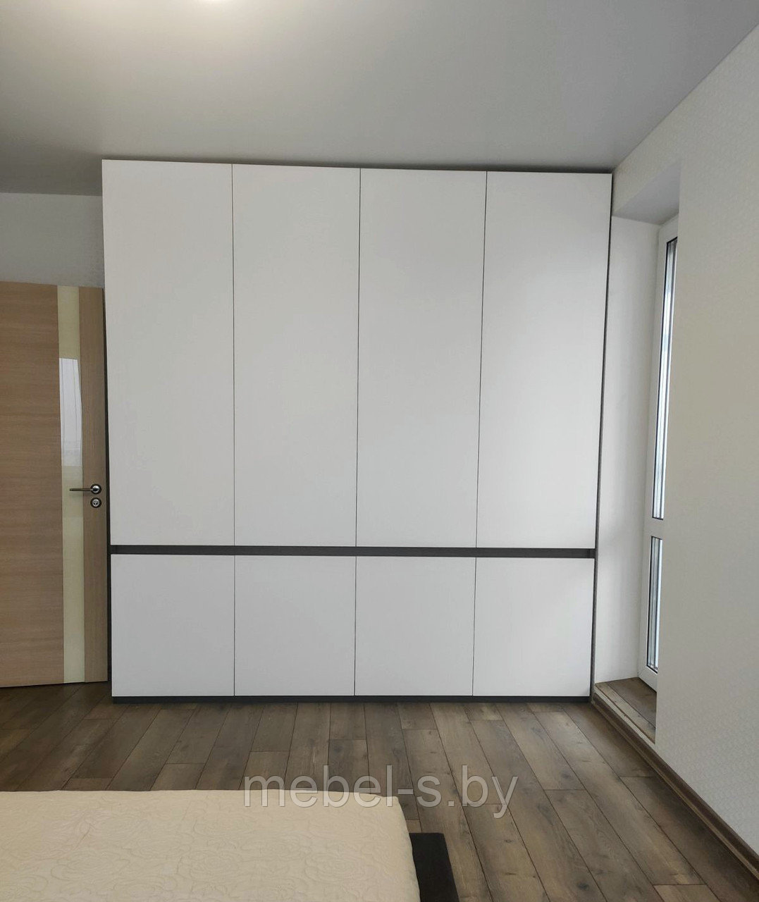 Шкаф изготовлен из ДСП Эггер белого цвета+ Диамант серый. Все двери распашные с петлями на доводчиках. Имеется много внутренних шуфляд на шариковых направляющих с доводчиками.