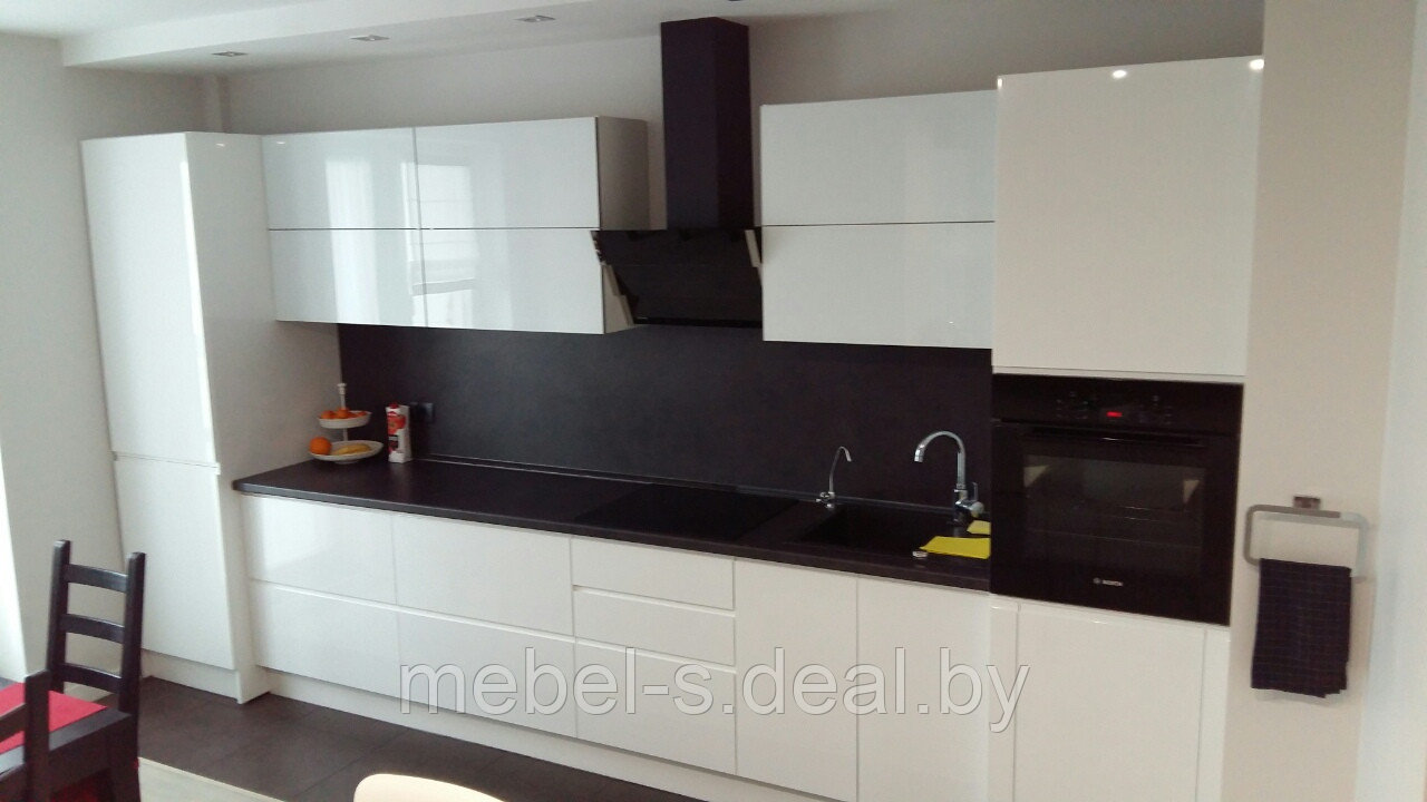 Комбинированная кухня: низ- МДФ крашеная Белый глянец, верх- стекло Лакобель Ультрабелый в алюминиевом профиле. Постформинг и скинали Juan. Фурнитура Blum с доводчиками. Встроенный в пенал холодильник, посудомоечная машина встроена под духовку.