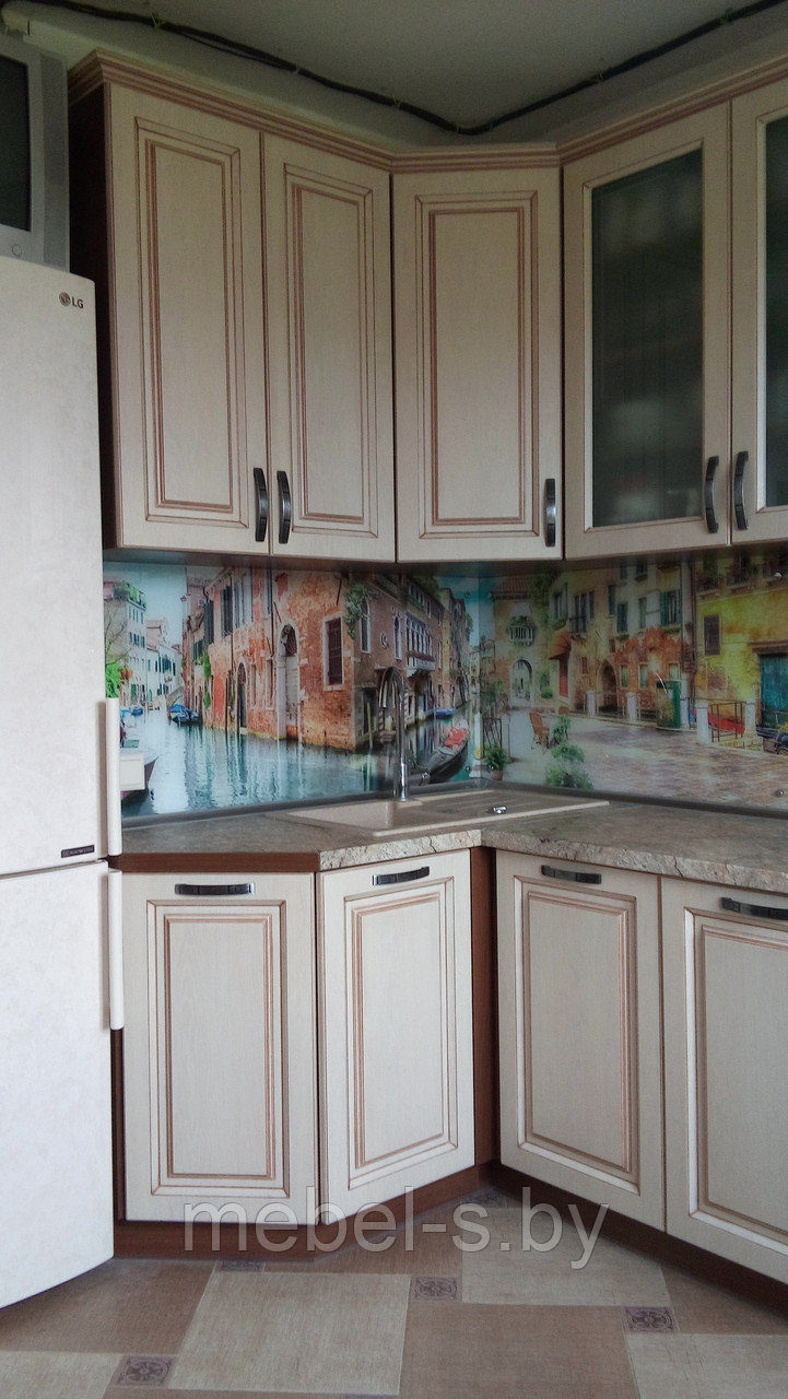 Кухня с фасадами крашеный МДФ с патинированной филенкой. Рабочая стена- скинали с фотопечатью "Венеция"
