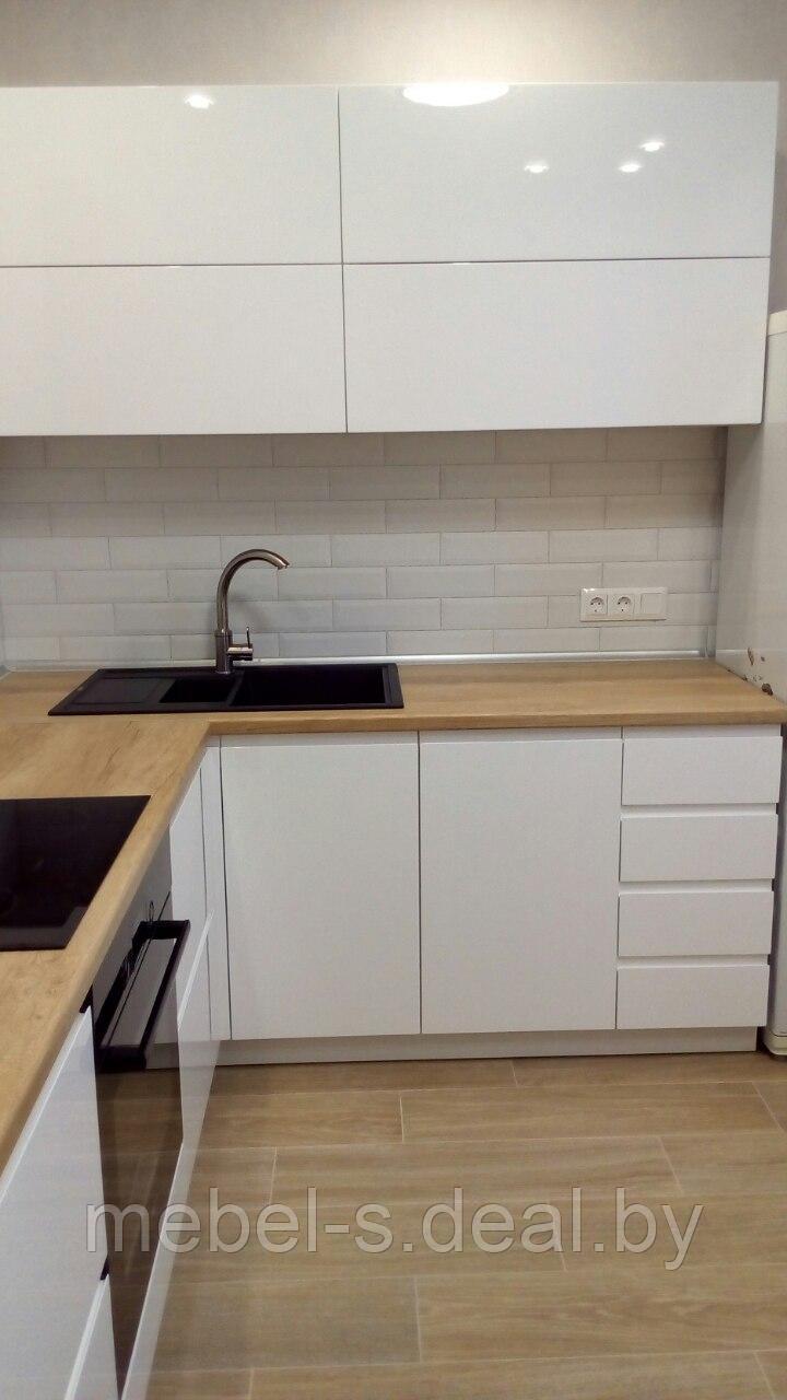 Фасады МДФ крашеная белый глянец с интегрированной ручкой, постформинг Juan Дуб Небраска 38мм, плинтус пристенный алюминиевый, выдвижение- тандем GTV полного выдвижения с доводчиком, подъёмник Blum Aventos HF
