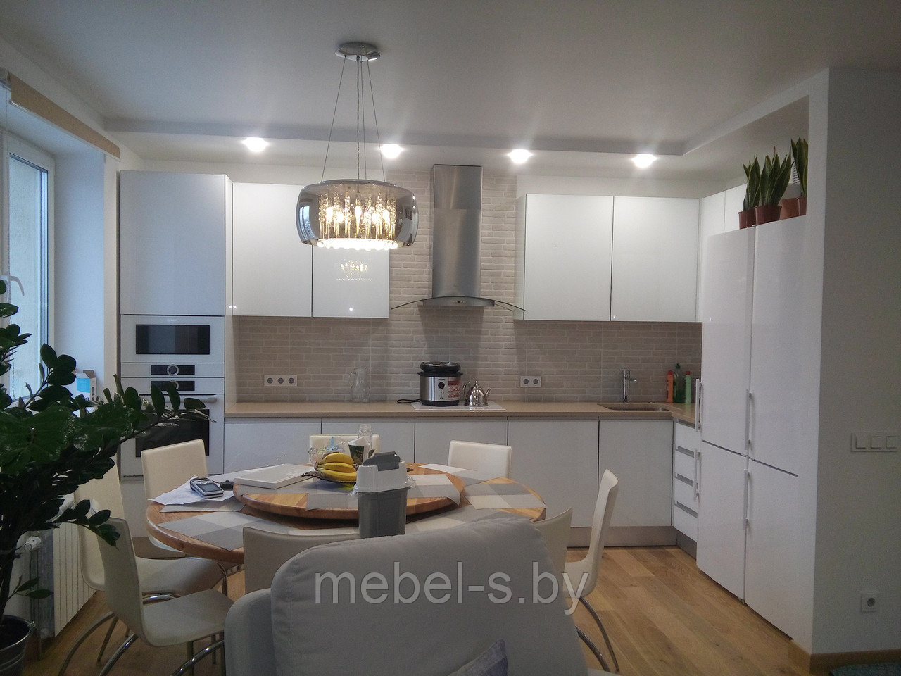 Кухня с фасадами из стекла Лакобель в алюминиевом профиле (низ- стекло на ДСП). Интересный нюанс- выдвижные ящики спрятаны за цельными фасадами.