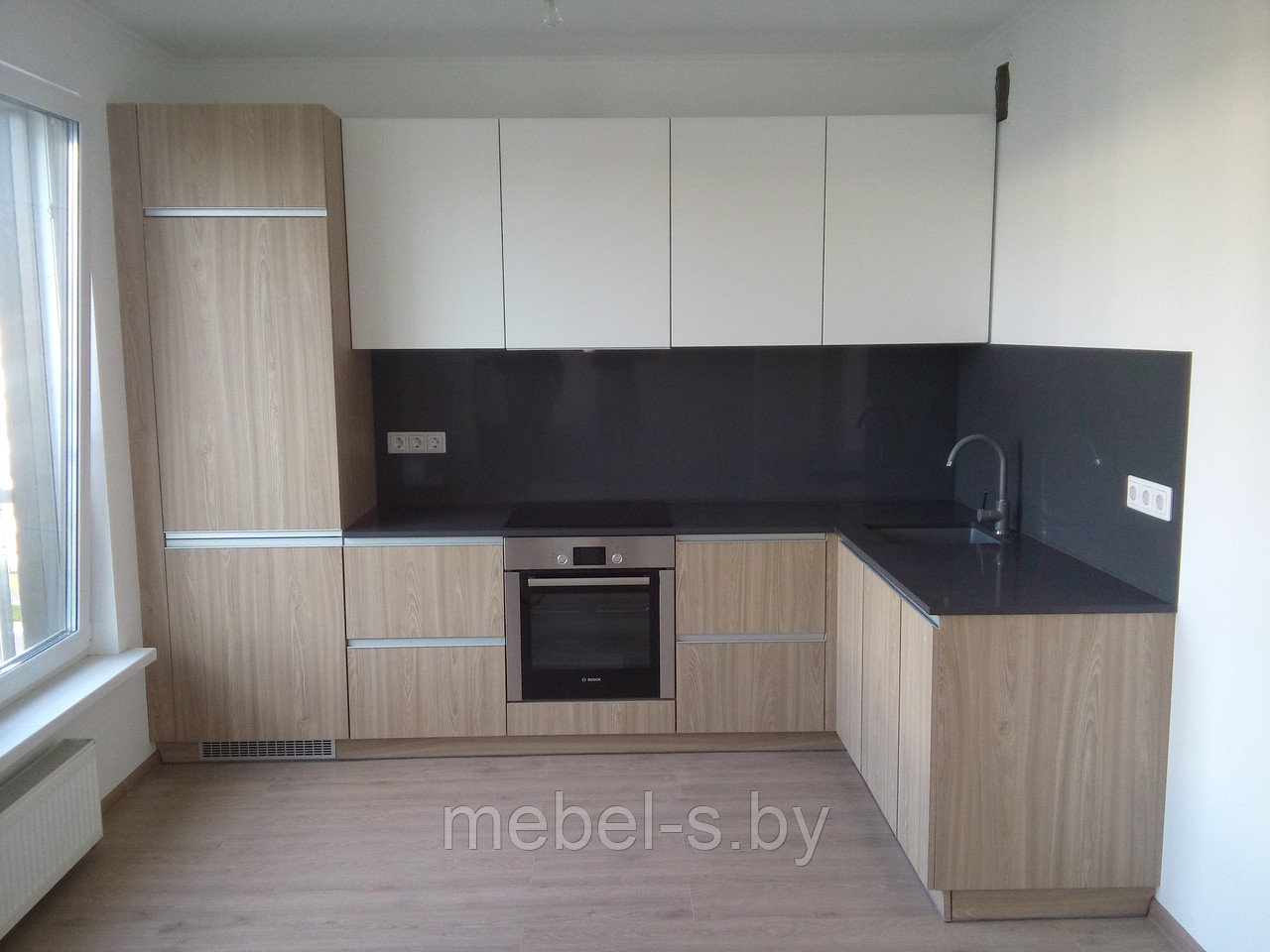 Фасад нижний- ДСП Вяз Тоссини натуральный, верх- МДФ крашеная матовый белый. Постформинг и скинали- искусственный камень. Ручка алюминиевая UKW02