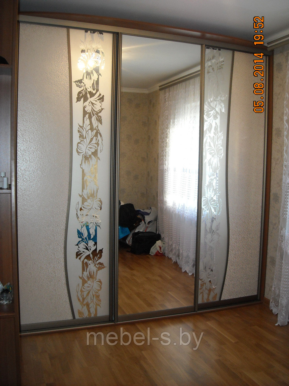 Шкаф-купе с фасадами из зеркала, экокожи и с пескоструйным рисунком.