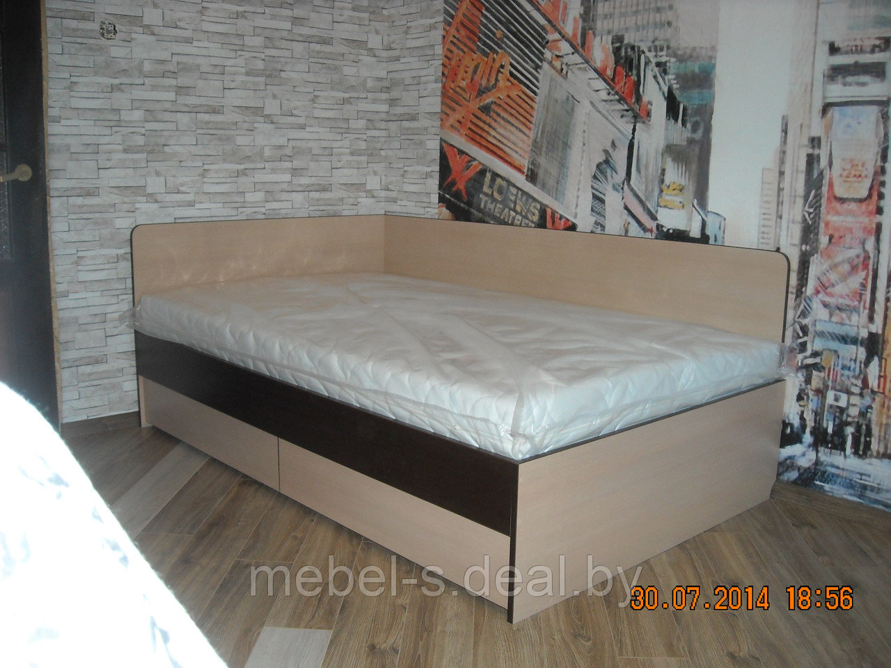 Корпус мебели изготовлен из ДСП ламинированной 18 и 36мм. Цвета: Лимба светлая+ Лимба шоколадная, кромка ПВХ Лимба шоколадная. Тахта изготавливается любого размера, можно с дном или с нишей для ортопедического основания. Ящики в тумбах открываются без ручек: за счет специальных подрезок в фасадах, выдвижной механизм- шариковая направляющая полного выката. В столешнице сделан специальный вырез под подоконник. Двери шкафа-купе из стекла Лакобель и ДСП Лимба светлая, металлические элементы цвета Коньяк. Дверцы навесных ящиков - стекло Лакобель в алюминиевом профиле цвета Коньяк, открывание без ручек, оснащены газовыми лифтами для фиксации в открытом виде.