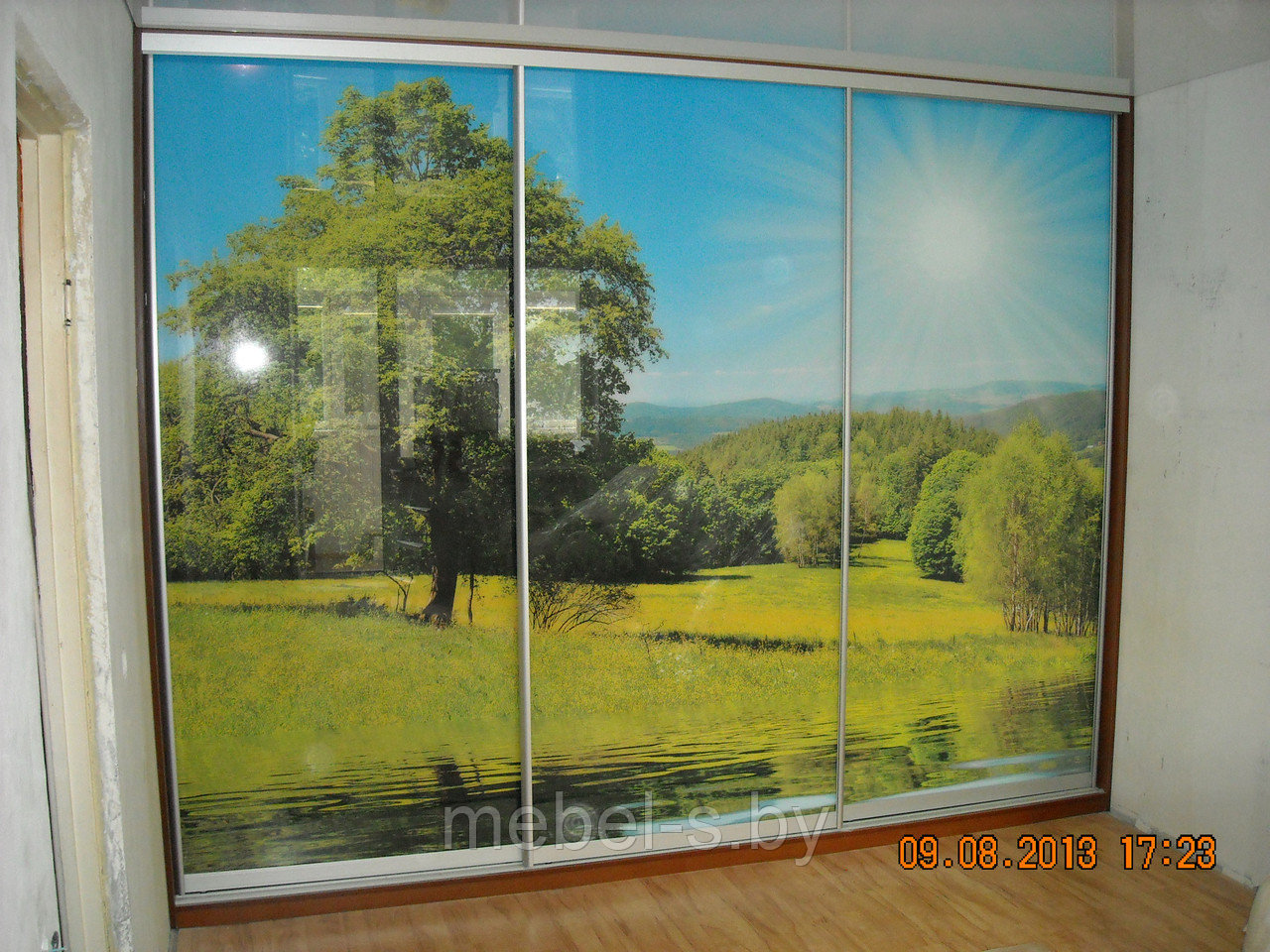 Шкаф-купе на 3 метра с отсеком для компьютерного стола. Фасады- фотопечать на стекле.